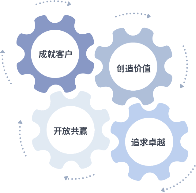 成就客户是一切决策的出发点,,,,创造价值是衡量所有工作的标准,,,追求卓越是我们做事做人的态度,,,,开放共赢是我们的格局也是最终的结果。。价值观的齿轮环环相扣,,,推动着组织里的每个人不断向前。。。。
